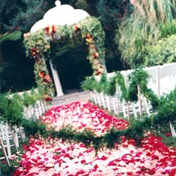 Las flores son fundamentales también. El pasillo, se puede adornar con pétalos de rosas en el suelo, a modo de alfombra, y con centros de flores apoyados en el suelo o colgando de soportes de hierro. También se puede colgar de las sillas de los laterales adornos florales.