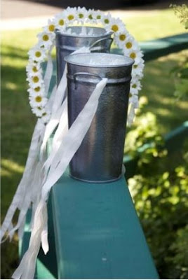 Las flores, son margaritas, por todas partes. También en cubos de metal galvanizado.